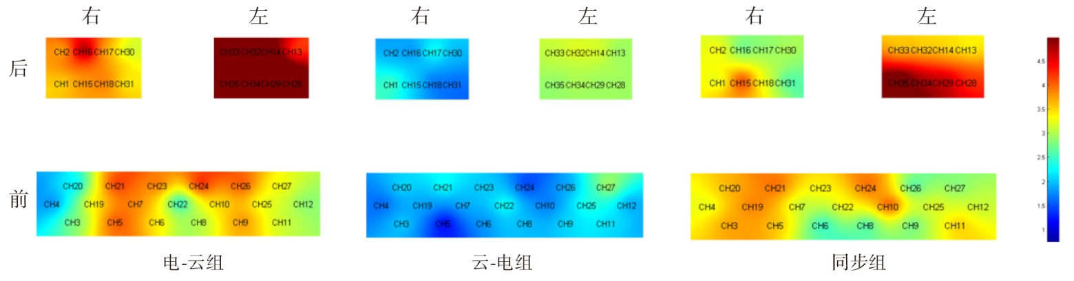 结果 脱落3例。所有感兴趣区中,HbO2浓度组间效应均显著(F > 3.697, P < 0.05),部分脑区交互效应显著(F > 3.276, P < 0.05)。事后比较,虽不同脑区略有不同,但大致呈现同步组≥电-云组>云-电组的趋势(P < 0.05)。
