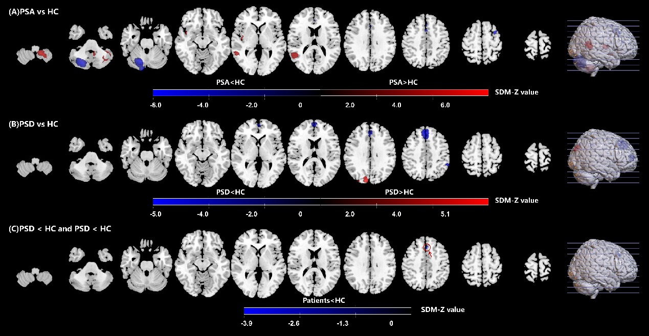 方法 系统检索建库至2025年4月19日PubMed、Embase、Web of Science、Cochrane Library、中国知网、万方数据库、维普、中国生物医学文献服务系统等数据库,纳入以PSA或PSD为研究对象,以健康人为对照组,以低频波动幅度(ALFF)、分数低频波动幅度(fALFF)和局部一致性(ReHo)为结局指标的静息态功能磁共振成像研究。提取纳入文献的差异性脑区相关结果,采用SDM-PSI V6.23 beta进行神经影像Meta分析。