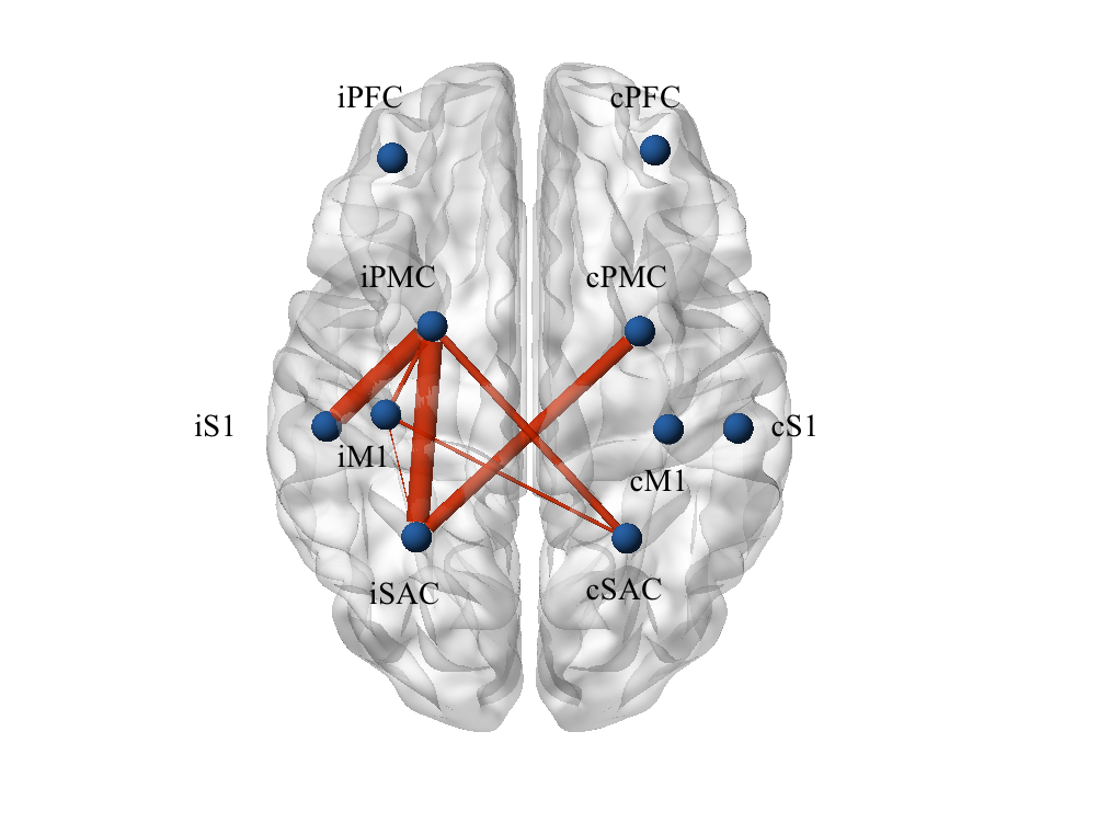 结果 与单纯手摇车训练相比,FES手摇车训练期间总体FC强度更高(t = 2.591, P < 0.05),患侧初级运动皮质(iM1)-患侧体感联合皮质(iSAC)、iM1-健侧体感联合皮质(cSAC)、患侧运动前皮质(iPMC)-iSAC、iPMC-cSAC、iPMC-患侧初级感觉皮质(iS1)、iPMC-iM1、健侧运动前皮质(cPMC)与iSAC间的FC增强(PFDR < 0.05)。