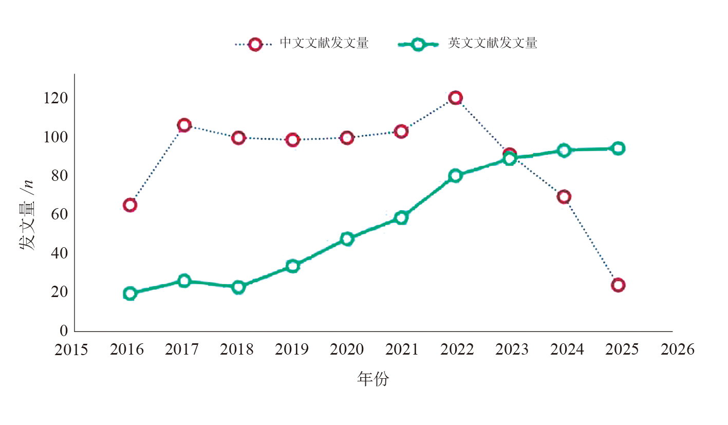 结果 共纳入1 331篇文献,其中中文文献810篇,英文文献521篇。英文文献发文量呈上升趋势。中国、美国和挪威发文量领先。中文文献发文量于2023年后下降。中、英文文献关键词分别形成41和51个聚类,整合为4个核心领域:疾病类型、危险因素、康复干预技术和疗效评价指标。中文文献多聚焦临床应用和技术整合,英文文献侧重于机制探索和精准干预。