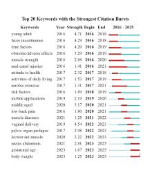 | 2 | 产后压力性尿失禁 | 170 | 0.11 | exercise therapy | 149 | 0.01 | |